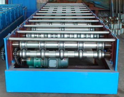 普通840型号彩钢瓦设备上模冲压工序:由电动机经过皮带轮,带动输入轴,经小齿轮,大齿轮,带动上轴,通过一套凸轮机构带动装有上模的滑动座上下运动,实现压瓦。