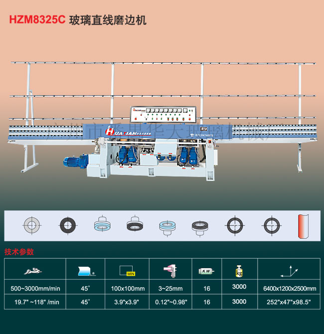 本机适用于不同尺寸和厚度的平板玻璃直边及两个棱角的磨削,机器采用无级变速器,可在运行中任意调节加工速度。工件磨削可粗、精磨及抛光一次完成,操作简便,工作效率高,且磨削质量好,是目前玻璃深加工设备不可少的工具之一。
