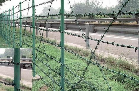 产品特点 :刺铁丝隔离栅主要分镀锌、浸塑两种,是以立柱加刺绳制作而成,主要用于高速公路、军事管理区、封山育林、植物园、区域分界、浏览区围栏等。其产品主要优点是安装简易,施工速度快。